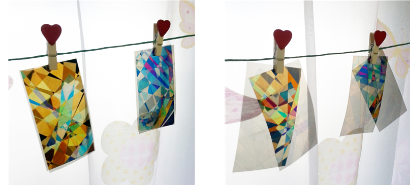 창문에 노끈 줄을 연결하고 집게로 걸어주었습니다. 왼쪽은 2장의 필름을 완전히 겹쳤을때, 오른쪽은 비스듬히 겹쳐진 사진입니다.