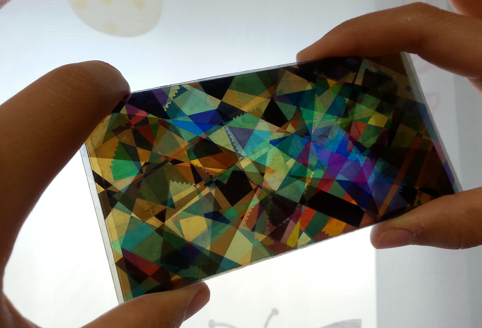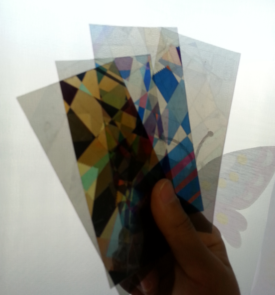 LCD모니터가 아닌, 창문에 걸어 알록 달록한 빛을 보려면 다른 편광필름이 한장 더 필요합니다. 나머지 한장은 테이프를 전혀 붙이지 않아도 되고, 테이프를 붙여도 됩니다. 2장, 혹은 그 이상의 필름이 겹쳐지는 각도에 따라 다양한 색이 나타납니다.
