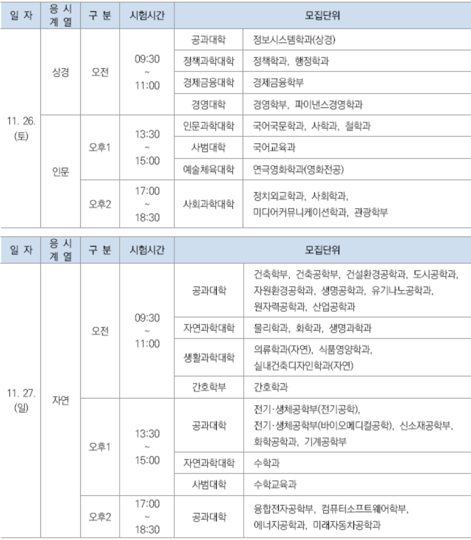 • 고사장 배정 및 유의사항 공지 : 11. 21.(월) 이후 입학처 홈페이지에 공지