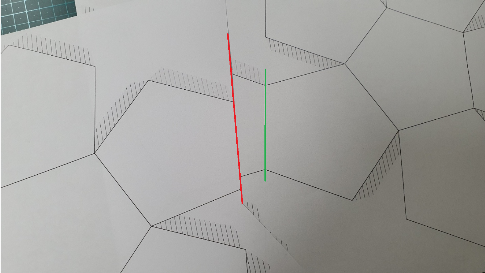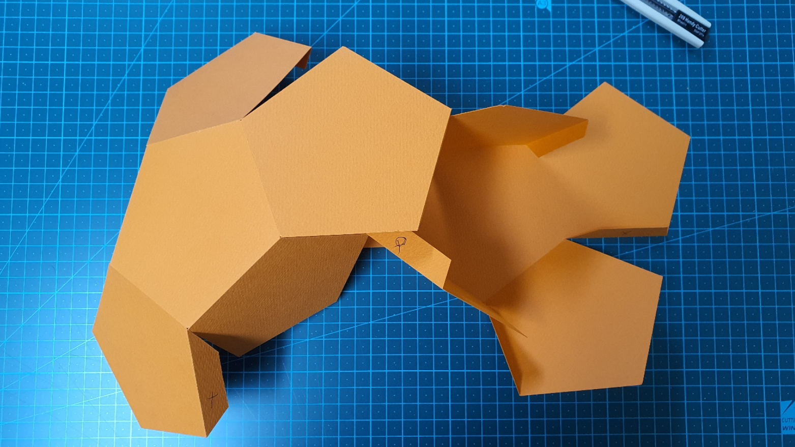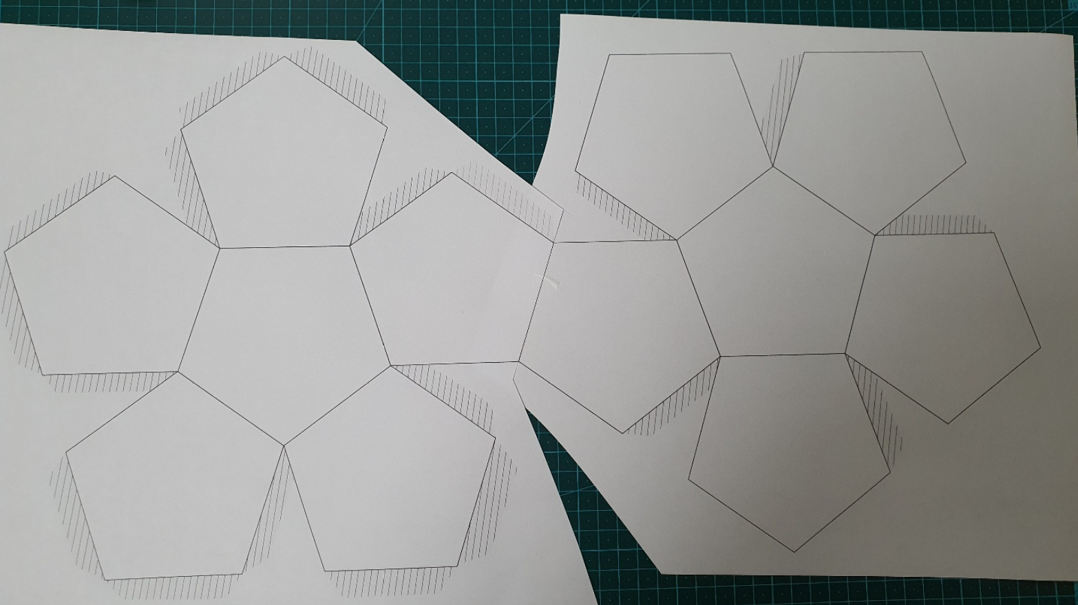 발표자료로 쓸 모형이니 도톰한 머메이드 4절지에 들어가게 작업해보려합니다. 정십이면체 전개도가 길쭉해서 A3 용지 2장을 붙여봤습니다. 앞장에서 빨간선 부분을 잘라서, 뒷장의 같은 위치에 붙여서 전개도를 이어 주었습니다.