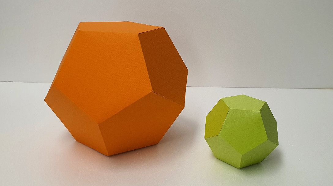 이전에 A4사이즈에 맞춰 접었던 정십이면체와 비교 사진입니다. 왼쪽이 4절지 머메이드지에 작업한 것이고, 오른쪽은 A4에 맞춰진 전개도로 작업한 크기입니다.