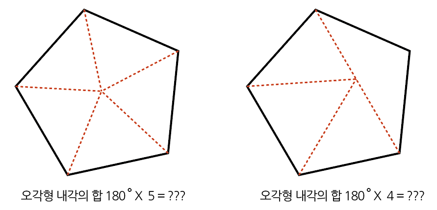 다각형의 내각의 합을 구하기 위해, 다각형 내부를 삼각형으로 분할하여 계산하는 방법을 사용하는데, 우리 아이들은 다음과 같이 나눌지도 모릅니다.
