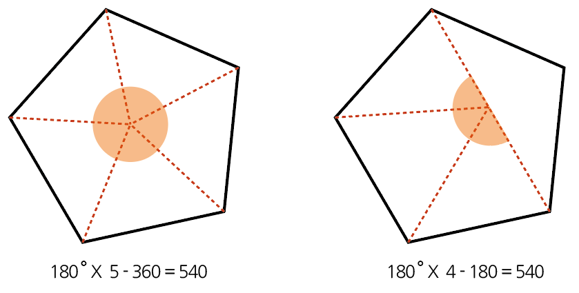 즉, (180도 X 5) - 360도 = 540도로 같은 값이 나옵니다.