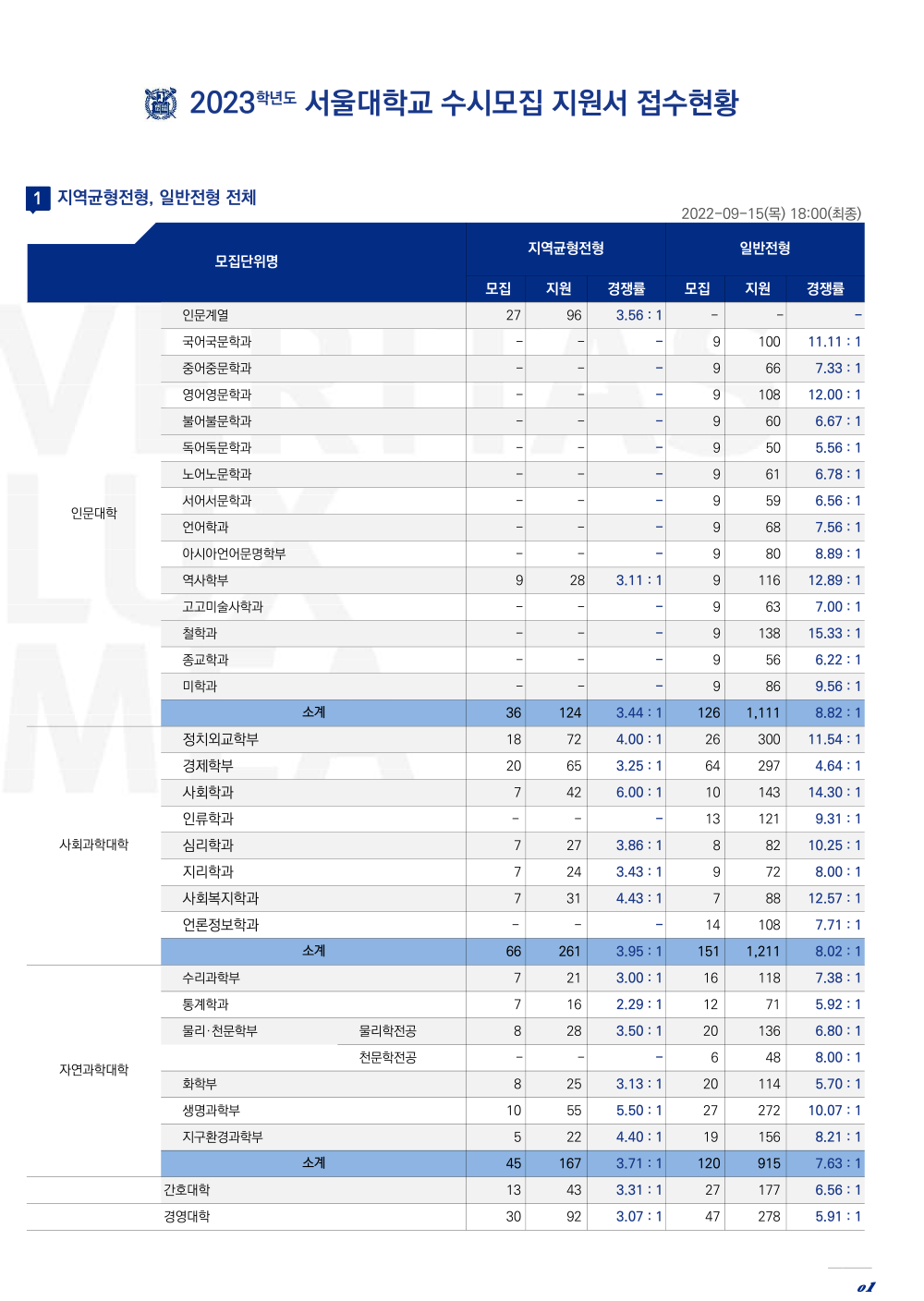 서울대 인문대학은 (일반전형 기준) 철학과 15.33:1, 역사학부가 12.89:1로 마감했습니다. 서울대 사회과학대학은 (일반전형 기준) 사회학과가 14.3:1로 가장 높습니다.