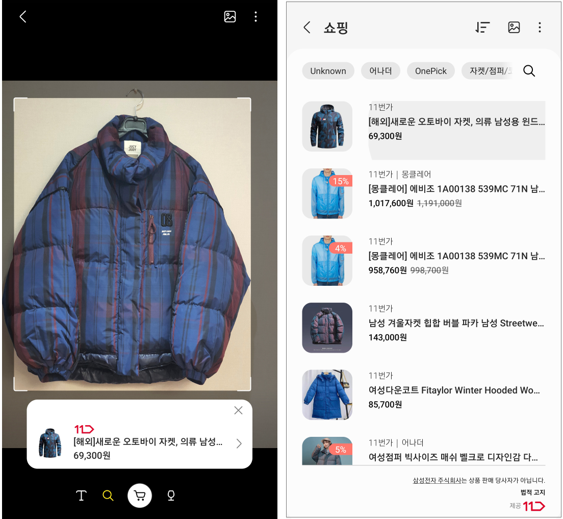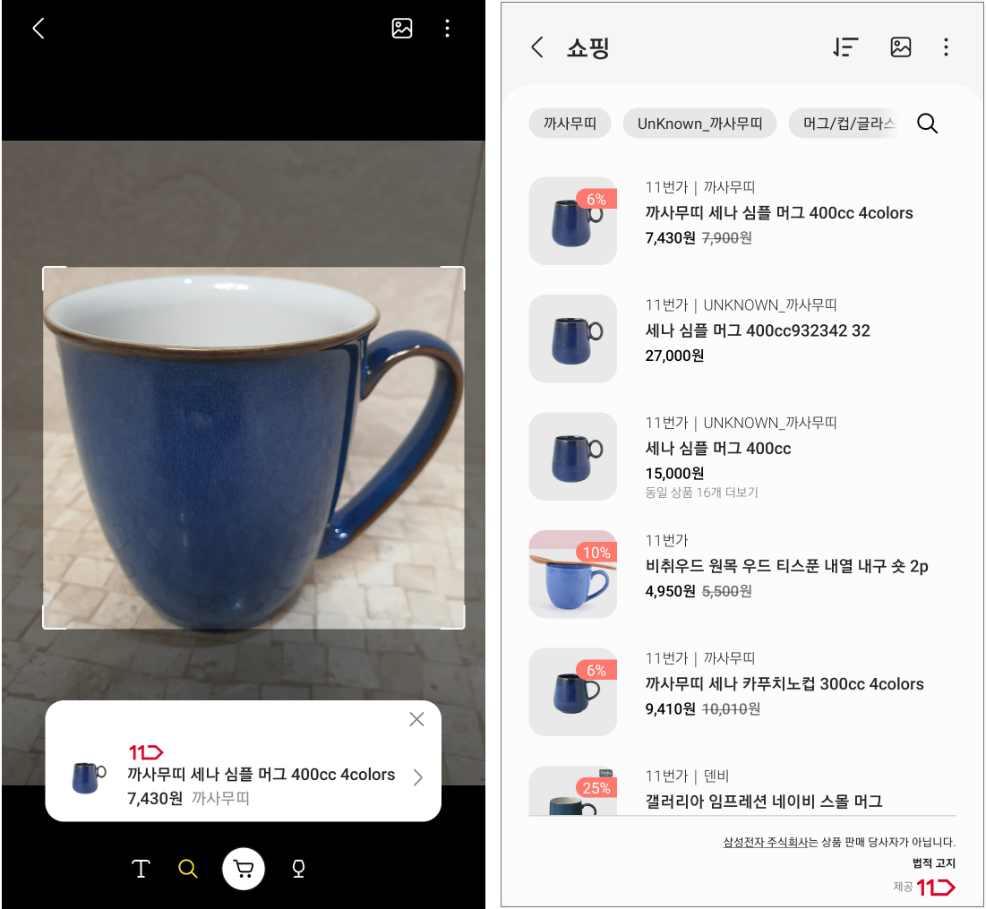 촬영한 이미지 안의 사물을 인식하고, 판매하는 물품의 경우 쇼핑으로 바로 연결해줍니다. 여러가지 사진을 찍어 테스트해보니, 사진 속 이미지에 제품과 관련된 텍스트가 포함되어 있으면 잘 찾는 것 같습니다.