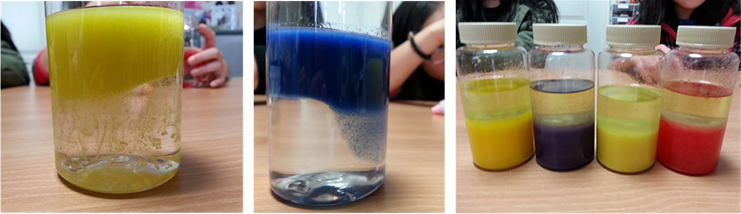 ● 액체는 밀도에 따라 층이 생기는데, 일시적으로 섞여 있더라도 시간이 지나면 다시 원래의 밀도에 따라 있어야하는 위치로 되돌아 간다.