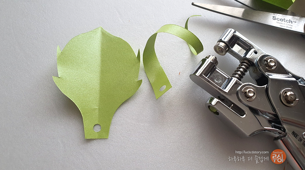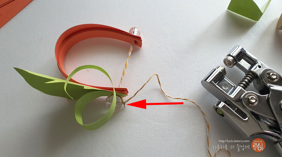 잎과 덩쿨도 줄에 끼워줘야하므로, 끝부분은 저렇게 오려서 구멍을 만들어줍니다.