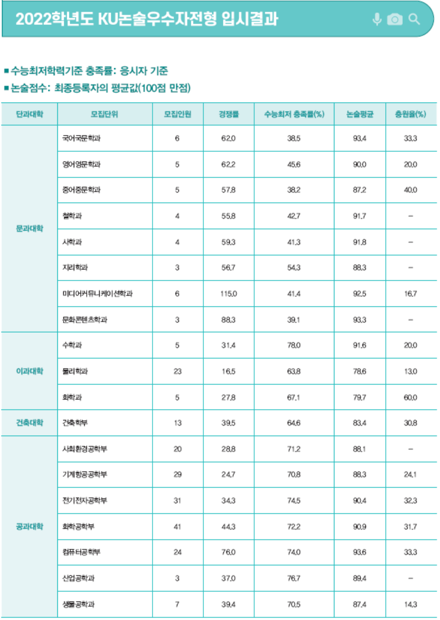 2022학년도 논술전형 결과에서 보는 것처럼 수능 최저 충족률을 반영하면 대부분의 학과가 경쟁률이 반 이상 떨어집니다. 인문계열의 최저요건이 더 높은데, 그래서인지 인문계열을 최저 충족률이 더 낮은 편입니다.