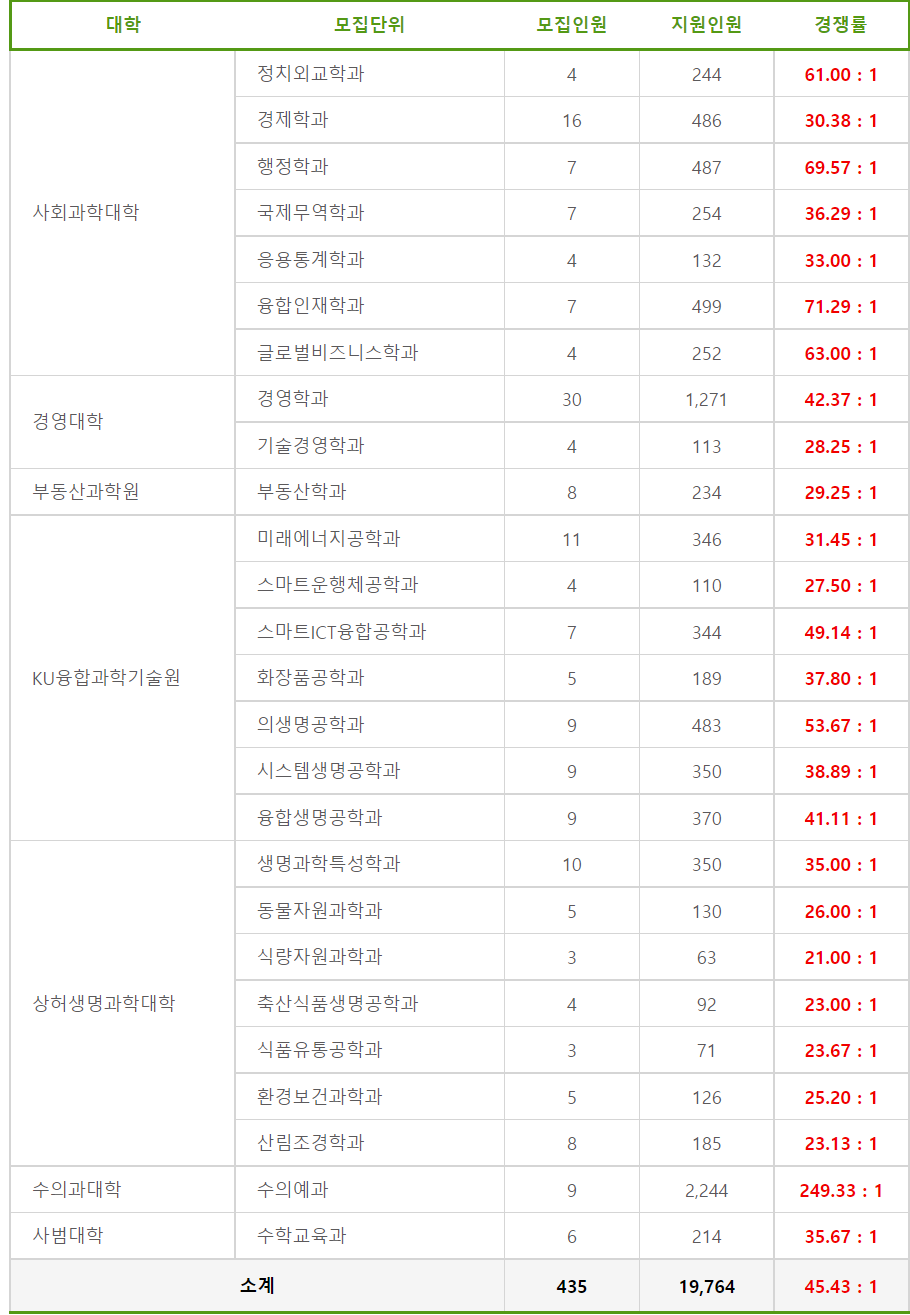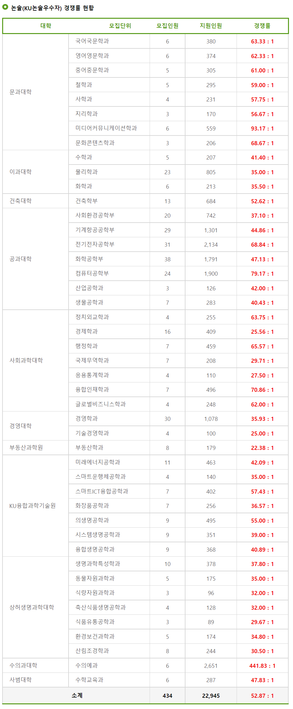전년도(45.4 : 1)에 비해 전반적으로 모든 학과의 경쟁률이 올라가 대학 논술전형 전체의 경쟁률은 52.87 : 1 입니다.