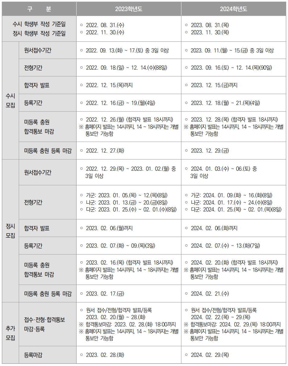 다음은 2023학년도와 2024학년도의 전체(수시/정시/추가) 일정입니다. 정시일정이 좀 더 뒤로 밀렸습니다.
