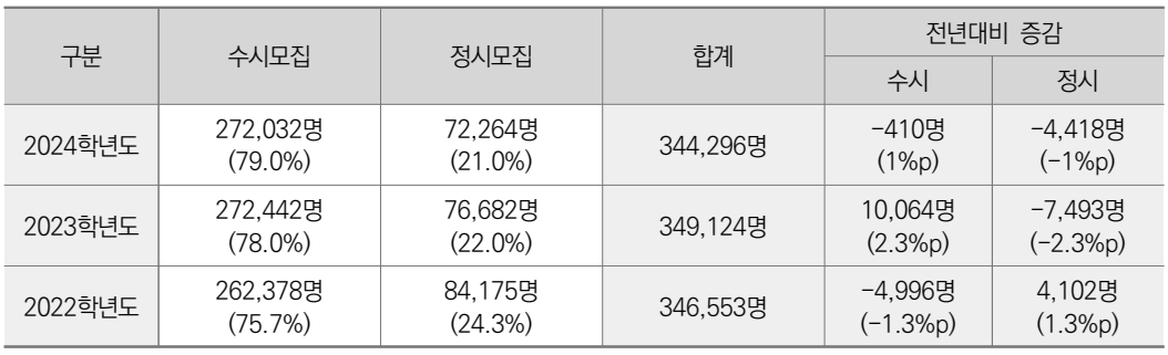 수시 및 정시 모집 비율은 전년도 기준 소폭 변동이 있습니다.
