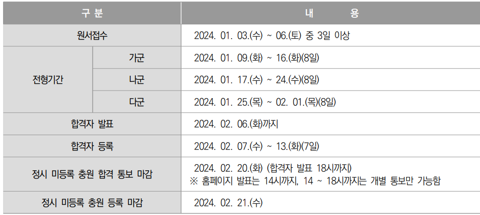 >>> 정시모집요강은 9월에 발표되지만, 수시합격자들의 등록기간이 12월이기때문에 정시원서 접수 전 정시이월 인원을 확인해야합니다. 2024학년도 입시의 경우, 수시미등록충원이 마무리되는 2023년 12월 29일 이후 수시모집에서 생긴 결원을 반영한 실제 정시모집인원이 발표됩니다.