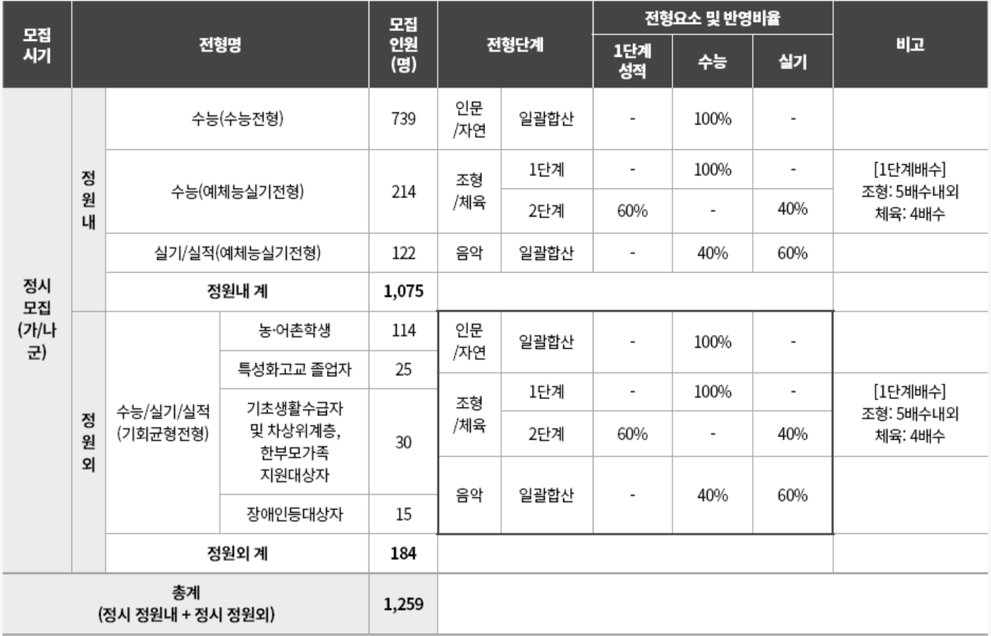 정시모집 계열별 통합 선발 및 학부/학과별 선발 동시 실시