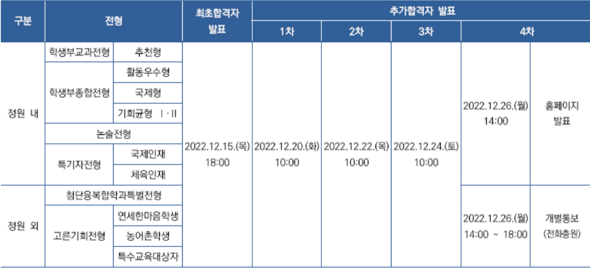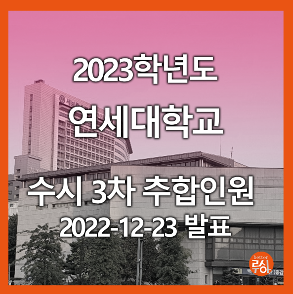 [추가업데이트] 2023학년도 연세대 수시 추가발표 1차 update 2022/12/19 발표자료 https://lucia.tistory.com/275 [대입] 2023학년도 연세대 수시 추가합격발표 1차 update (활우, 교과, 논술 etc) 2023학년도 연세대