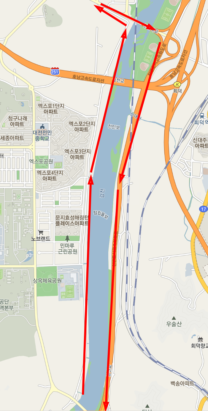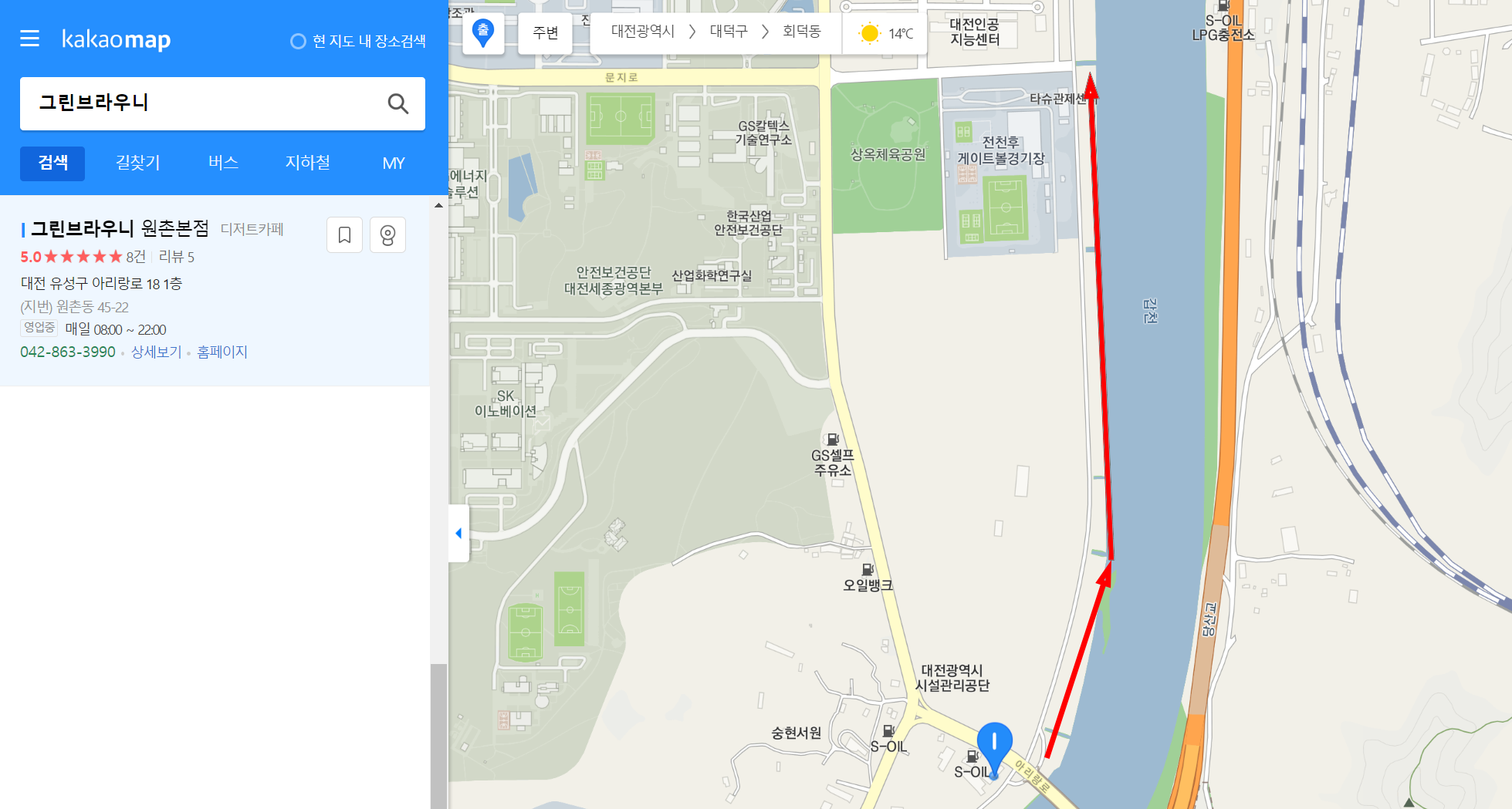 아래 지도에 표시한 장소가 그린브라우니이고, 빨간색 화살표로 표시한 길이 갑천을 따라 좁게 난 길입니다.