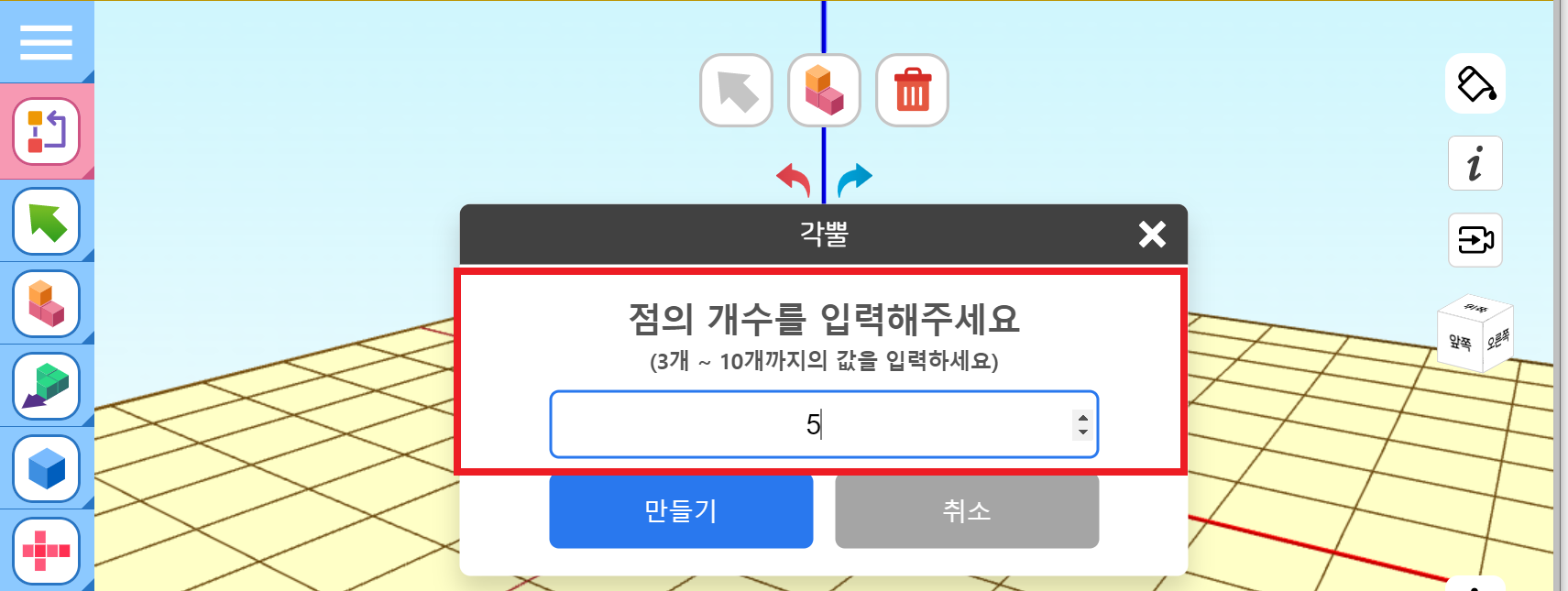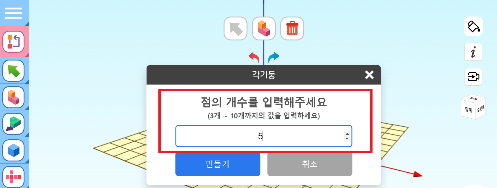 각기둥의 밑면 모양을 정하는 점의 개수를 먼저 입력해줍니다. 가장 작은 수는 3이고, 10각 기둥까지 가능합니다.