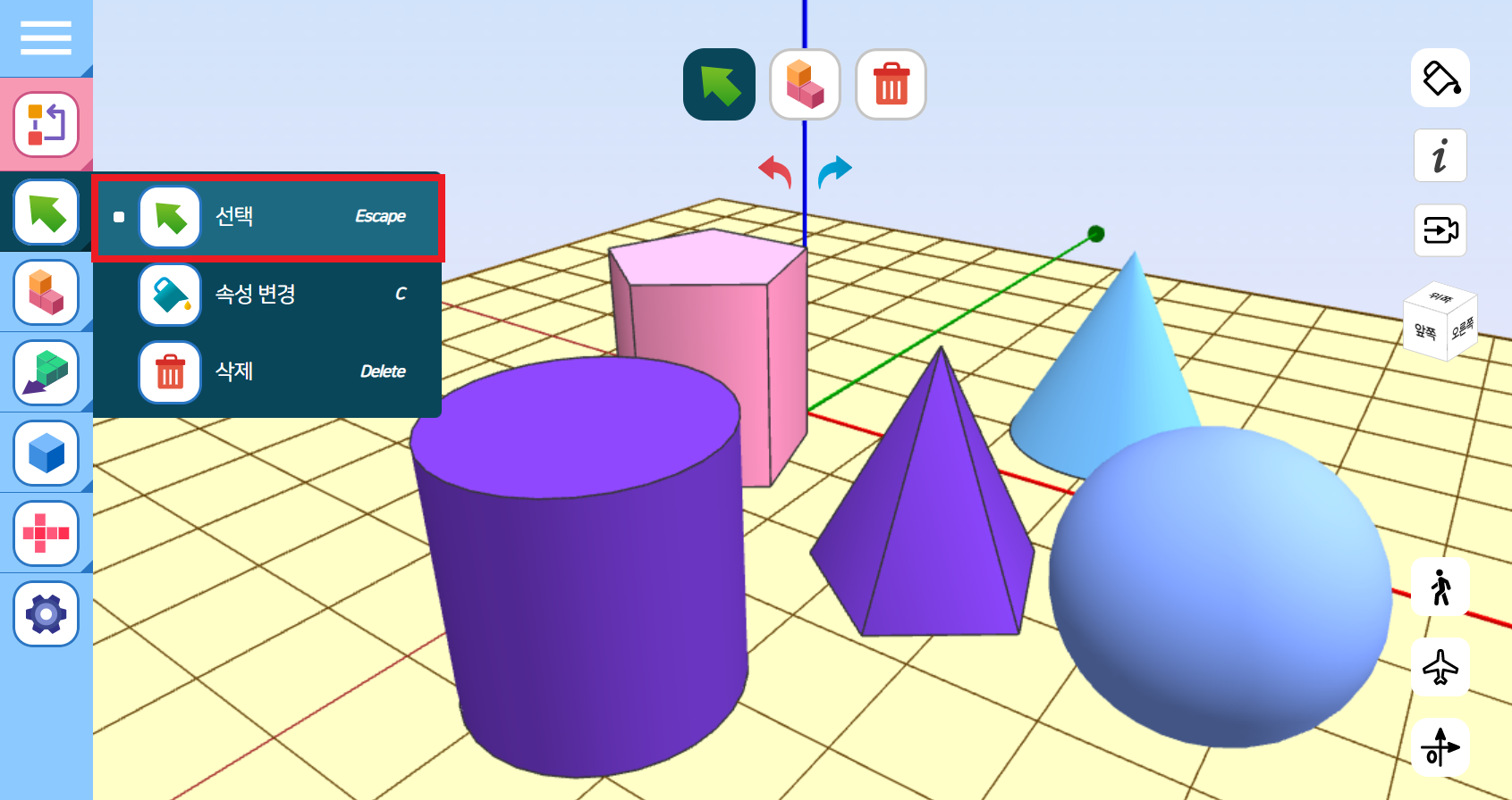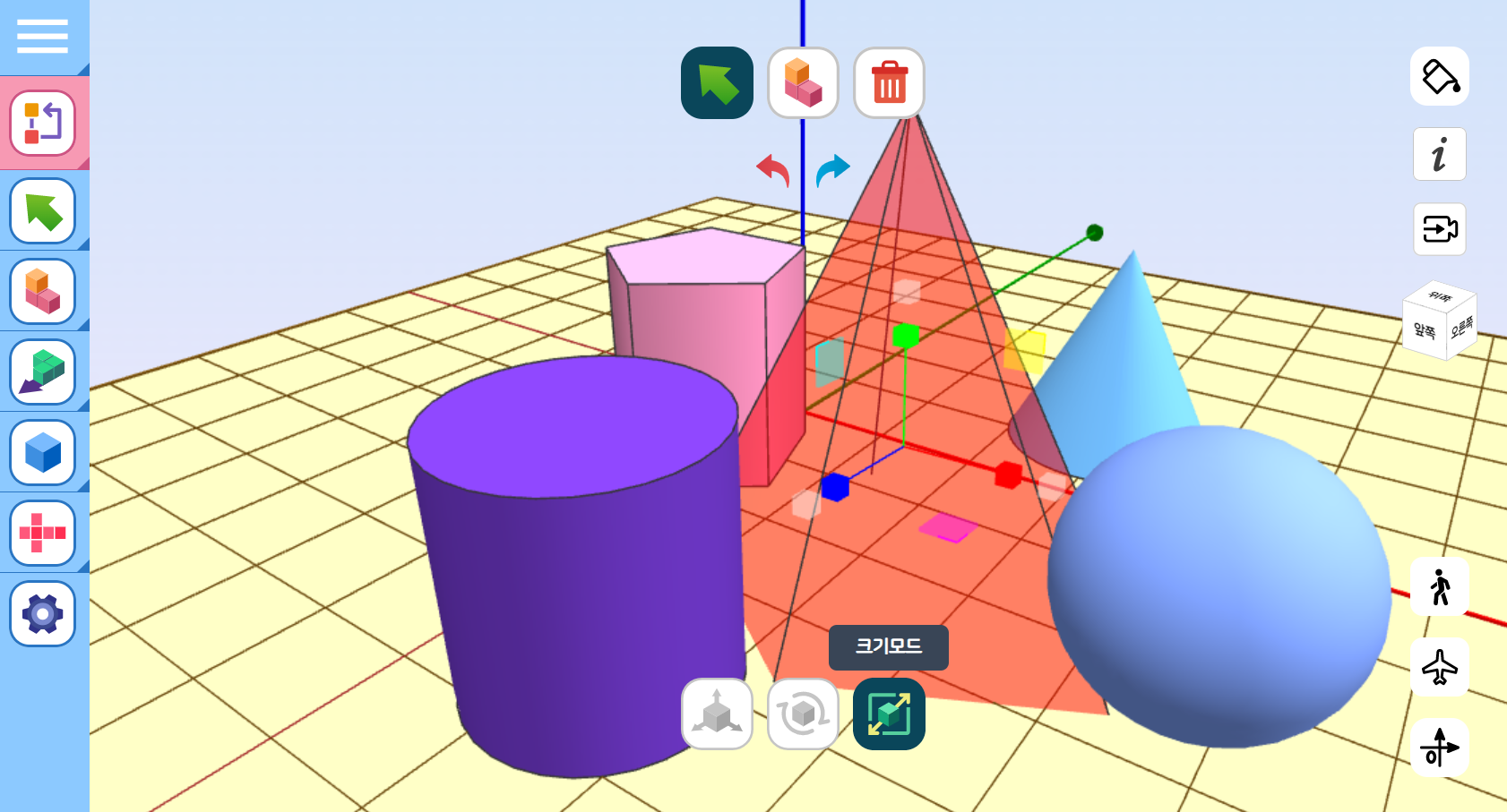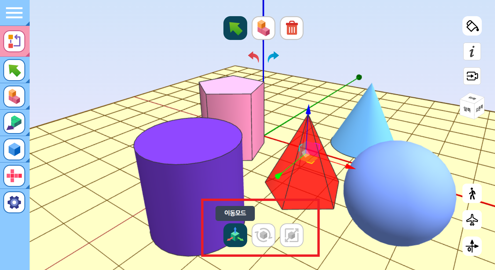 [선택] 도구를 클릭한 후, 만들어진 입체도형을 선택하면, 이동모드, 회전모드, 크기모드 등의 변경을 할 수 있습니다.