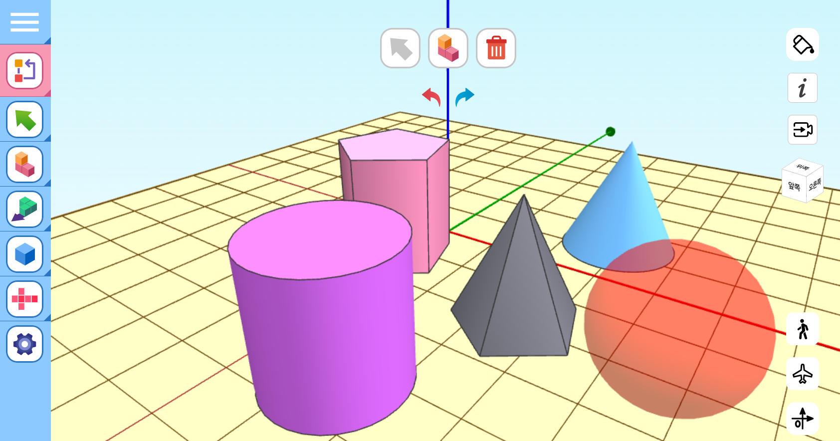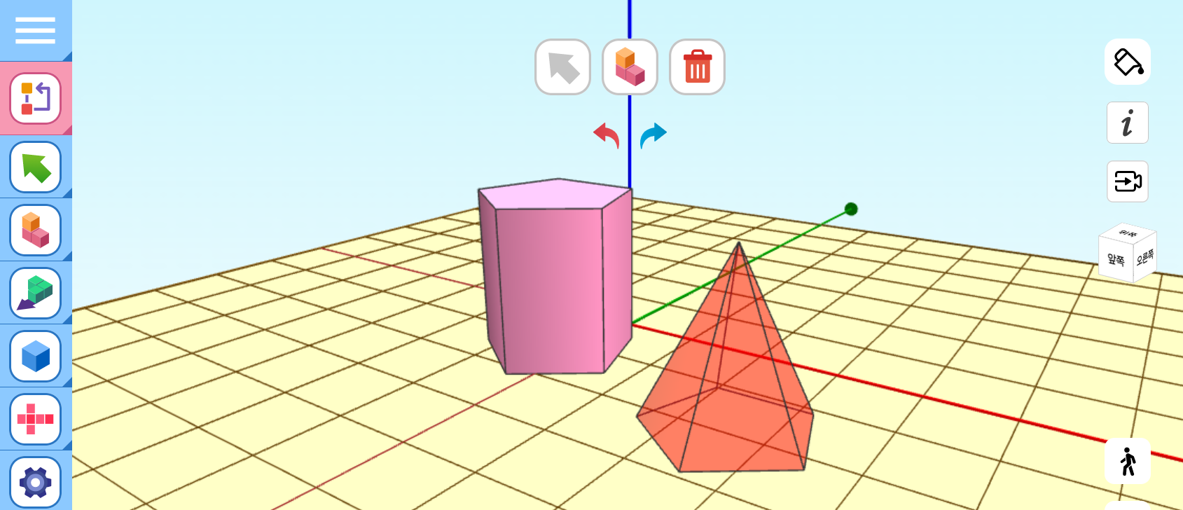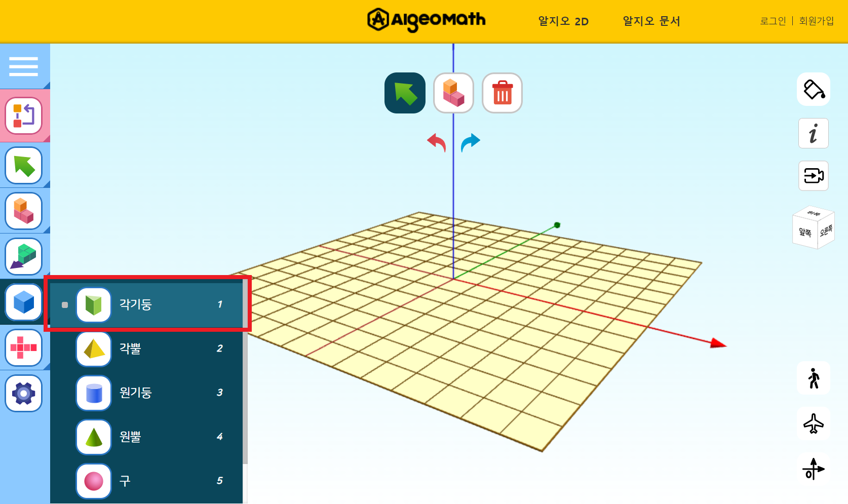 왼쪽 툴바에서 입체를 선택합니다. 각기둥, 각뿔, 원기둥, 원뿔, 구 순서로 되어있습니다.