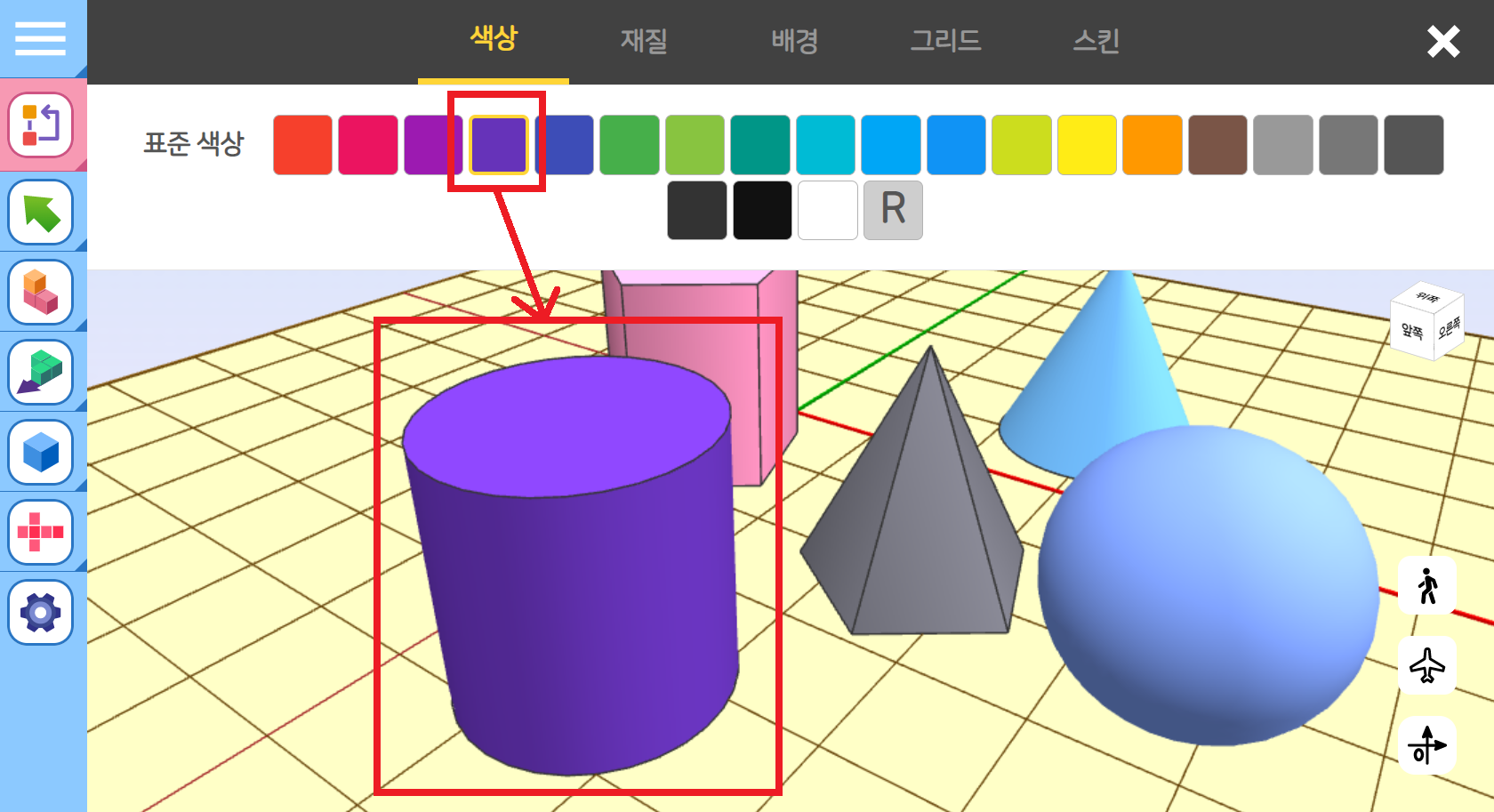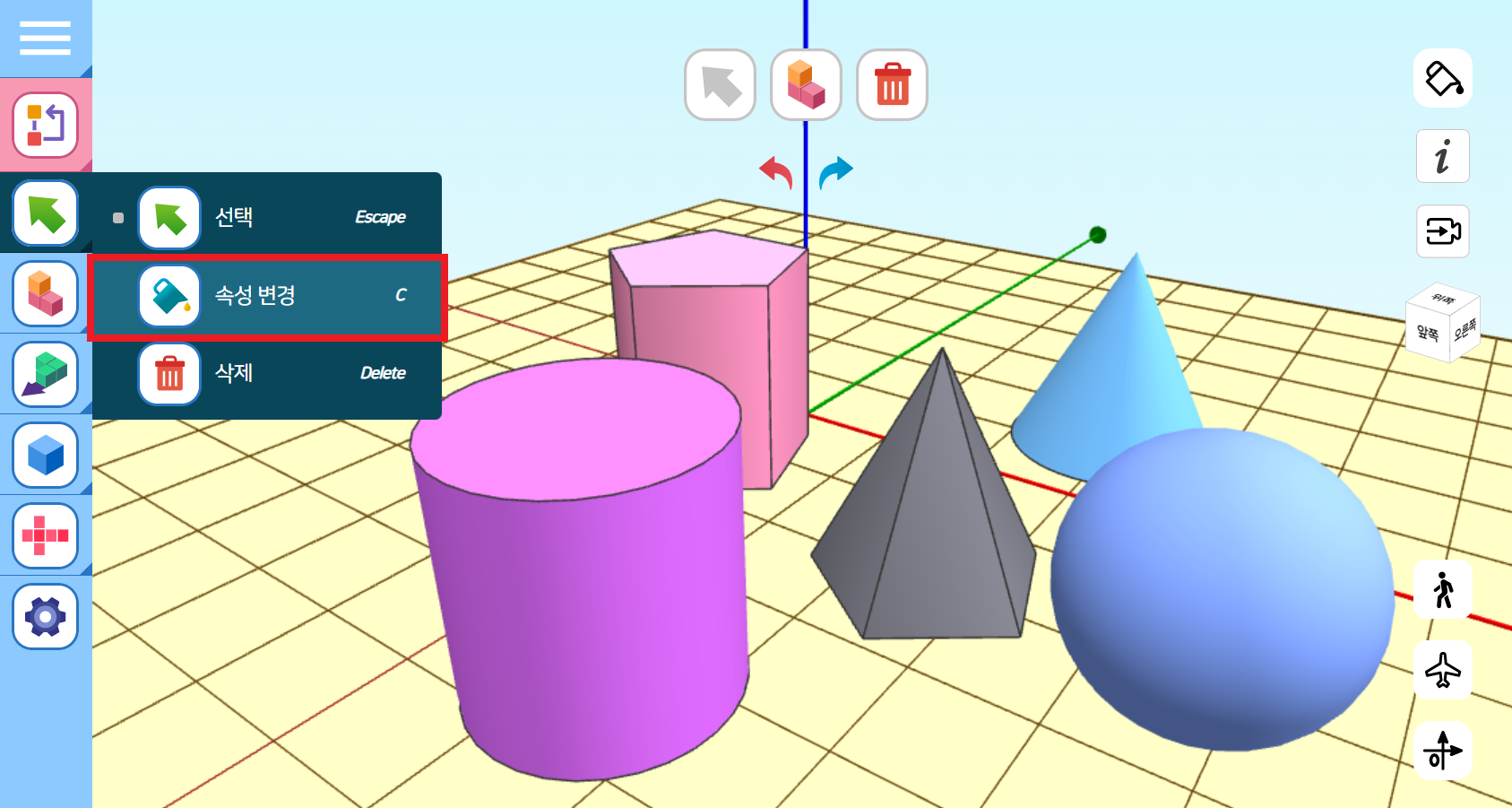 왼쪽 툴바에서 [속성 변경]을 선택하고 입체도형의 색상을 변경할 수 있습니다.