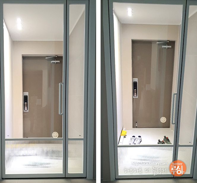 아래에 현관중문 얘기를 더 썼는데, 중문에는 이중이 아니라 모루유리 1장만 들어가서 올록볼록한 면이 만져집니다.