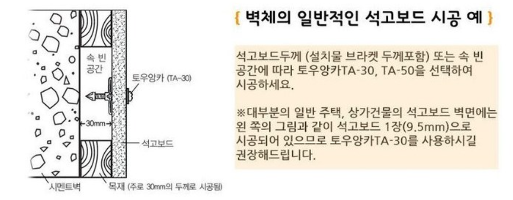 혹여 석고보드 면이라면 [토우앙카]를 사용해야한다고 해서, 추가 구입을 했습니다.