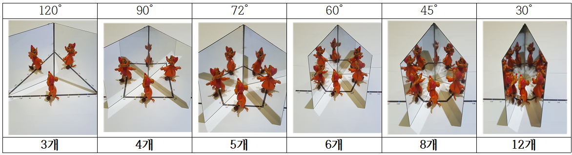 세 개의 거울을 120° 이루게 배치하면 반사된 상이 다시 반사될 거울을 찾지 못해 각 거울에 하나씩 상이 보이게 되고, 90° 이루게 배치하면 가운데에는 하나의 상이 생기지만 양쪽 맞은편으로 서로 반사에 반사를 거듭하여 무한하게 상이 반복되어 나타납니다.
