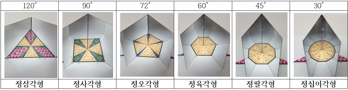 각 거울의 면이 60° 이루게 배치하면 만화경과 같은 형태로 한 꼭짓점에 6개의 상이 모이는 형태가 반복되어 나타납니다. 안에 구슬이나 작은 블럭을 넣고 관찰하면 좋습니다.