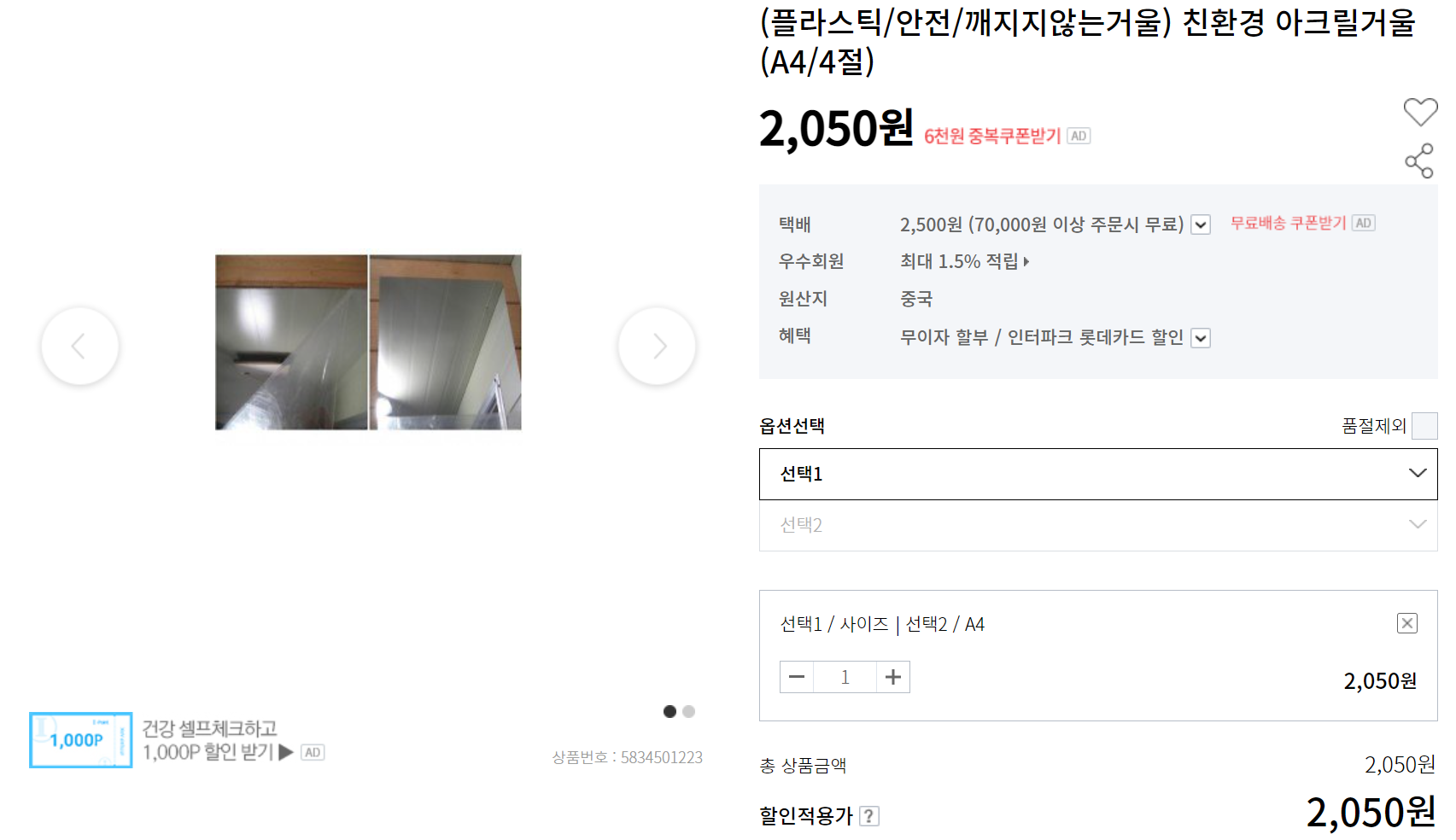 영상에서 사용한 체험용 아크릴거울입니다. 더 얇은 "종이거울"도 있는데, 이건 얇아서, 빳빳한 도화지에 붙여서 사용하면 됩니다.