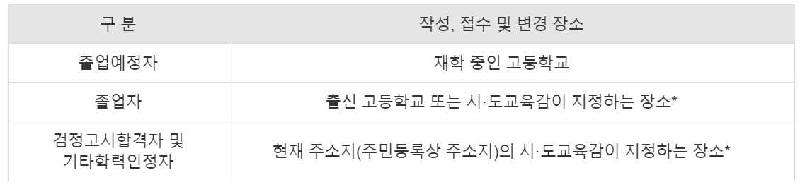 * 시·도교육감이 지정하는 장소는 현재 주소지(주민등록상 주소지) 관할 시험지구 교육지원청 또는 접수자가 일정 지역에 파견되어 접수하는 장소를 말함.