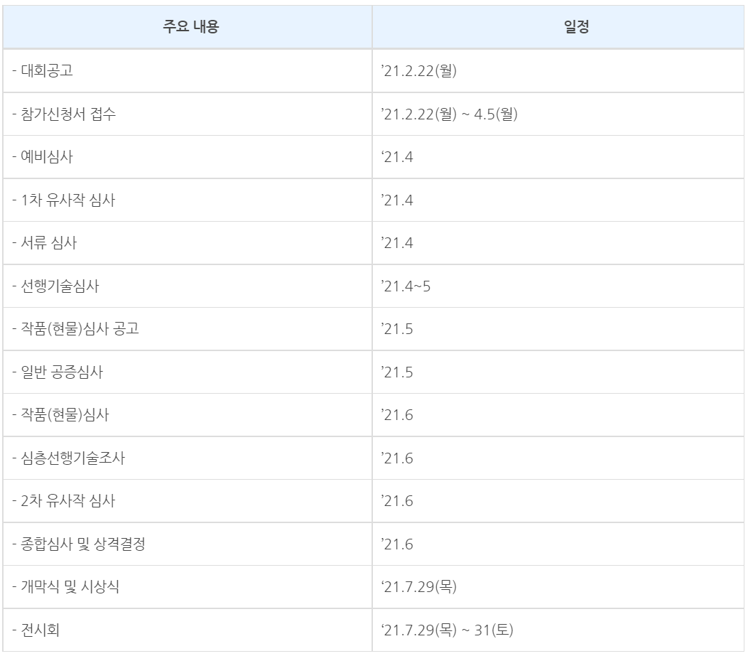 다음은 2021년 기준 일정입니다. 해마다 비슷한 시기에 진행되니 일정 참고하면 됩니다. 예선심사에서는 모집단위별 서류심사를 통한 우수작 선별하며 선행기술조사를 통한 유사성 검토 및 검증심사 병행합니다. 본선심사에서는 출품작품에 대한 대면 설명(5분 이내)을 진행하며 질의 응답식 심사로 진행합니다.