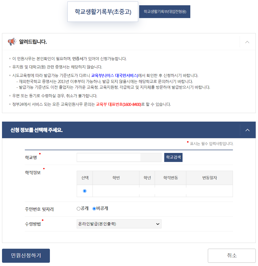 학교생활기록부로 일반(조회용)과 대입용으로 나뉘어 있습니다.
