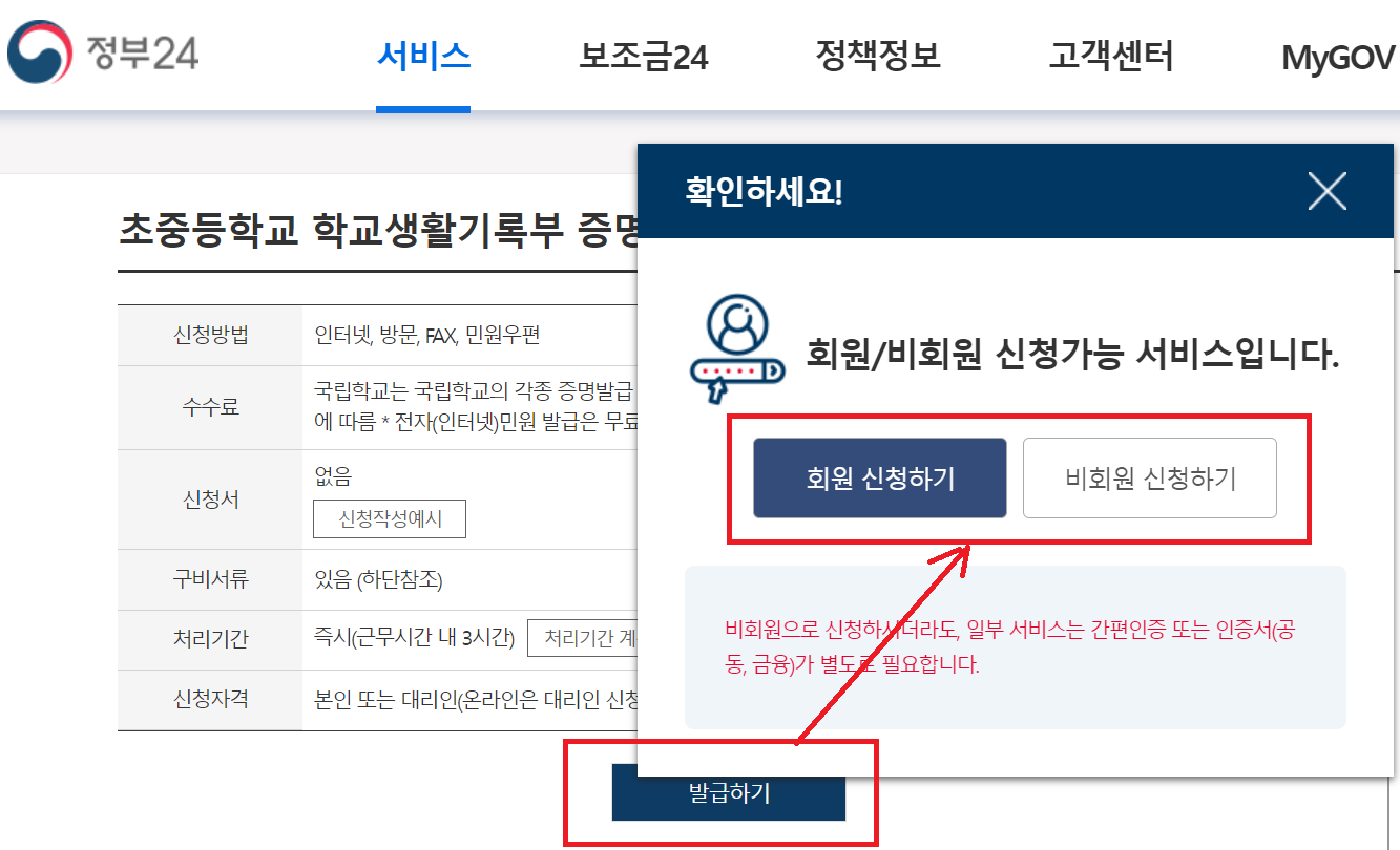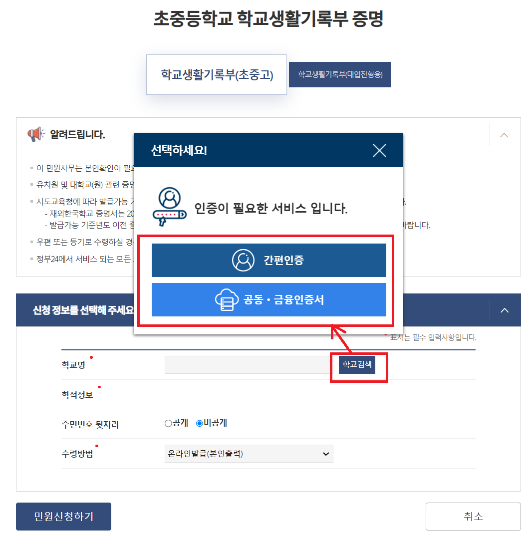 비회원으로 진행해도 학적 조회를 위해서는 인증절차를 걸쳐야합니다. 금융인증서, 간편인증 등을 준비해야합니다. 저는 비회원으로 신청하고, 본인인증은 아이명의로 공동인증서를 사용했습니다.