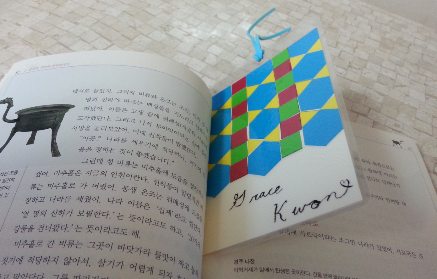 윗쪽에 펀치를 사용하여 구멍을 뚫고 장식끈을 달아 책갈피를 완성합니다.
