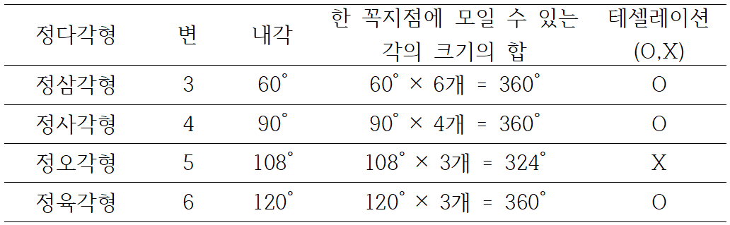 정다각형의 변의 개수, 한 내각의 크기를 알아보고 한꼭지점에 모을 수 있는 다각형의 개수를 알아봄으로써 테셀레이션이 가능한지 판단해 봅시다.