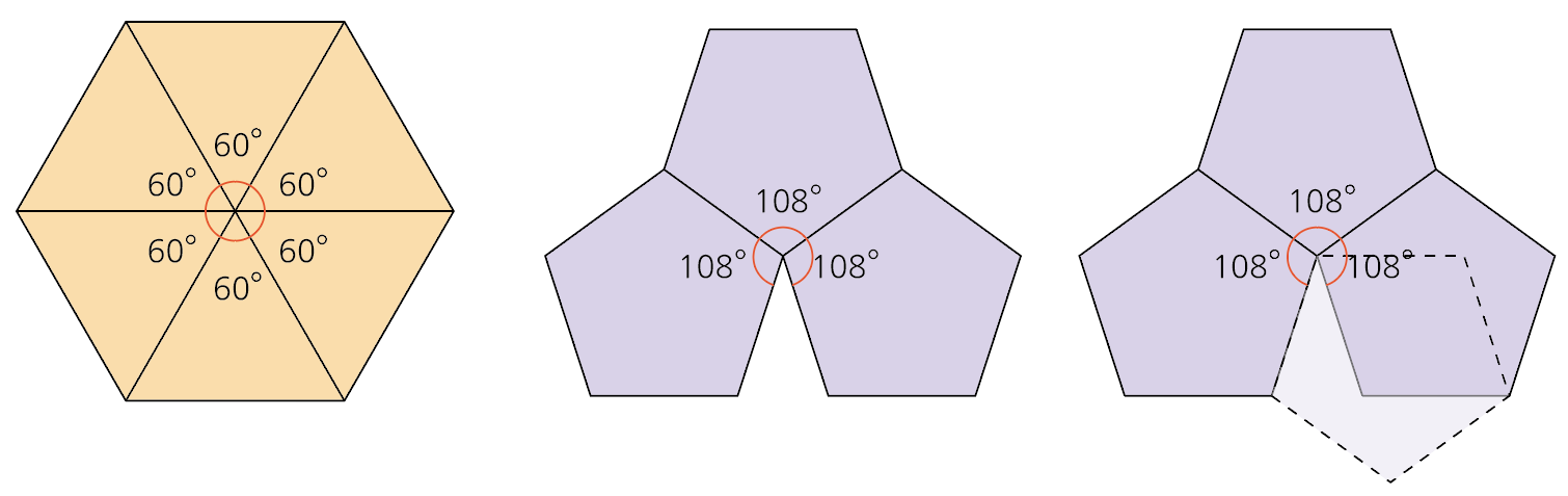정삼각형, 정사각형, 정육각형은 한 내각의 크기가 360°의 약수로 되어 있어서 테셀레이션이 가능하지만, 정오각형은 360°가 되지 않고 324°로 36°가 비는 모양이기 때문에 정규 테셀레이션이 불가능하게 됩니다.