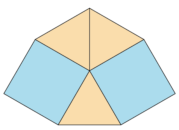 한편 정오각형의 한 내각의 크기는 108도이므로 3개 이하를 모으면 빈틈이 생기고, 4개 이상을 모으면 겹치는 부분이 생기게 되므로 정오각형만으로는 테셀레이션을 만들 수 없습니다.