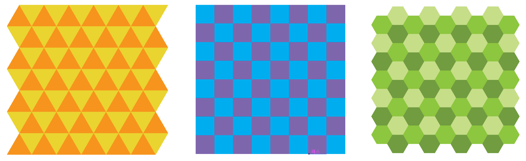 따라서 정규테셀레이션이 가능한 도형은 정삼각형, 정사각형, 정육각형, 이렇게 3가지만 가능합니다.