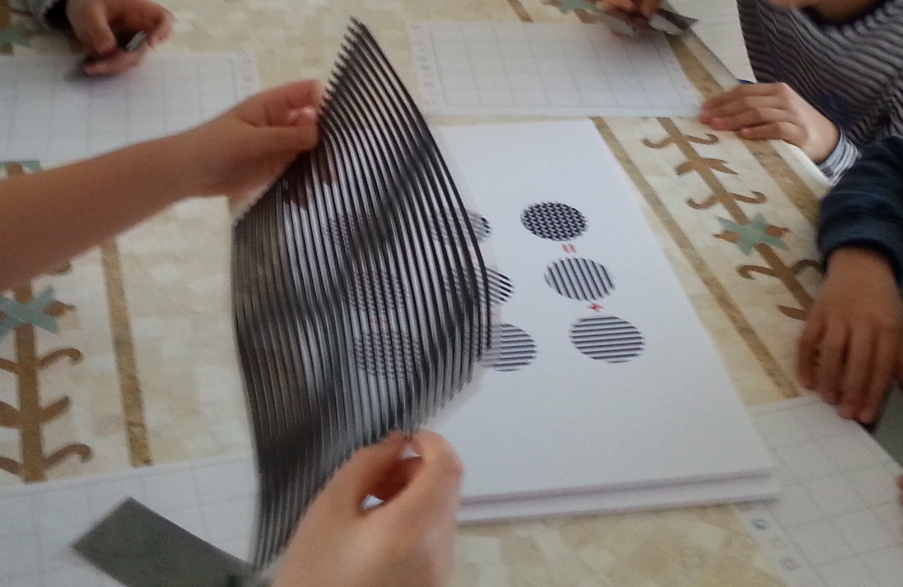 참고 : 아래 그림을 보여주며, 투명 OHP필름에 줄무늬를 인쇄해서 겹쳐돌려보며 편광필름의 개념을 이해할 수 있도록 도와주었습니다.