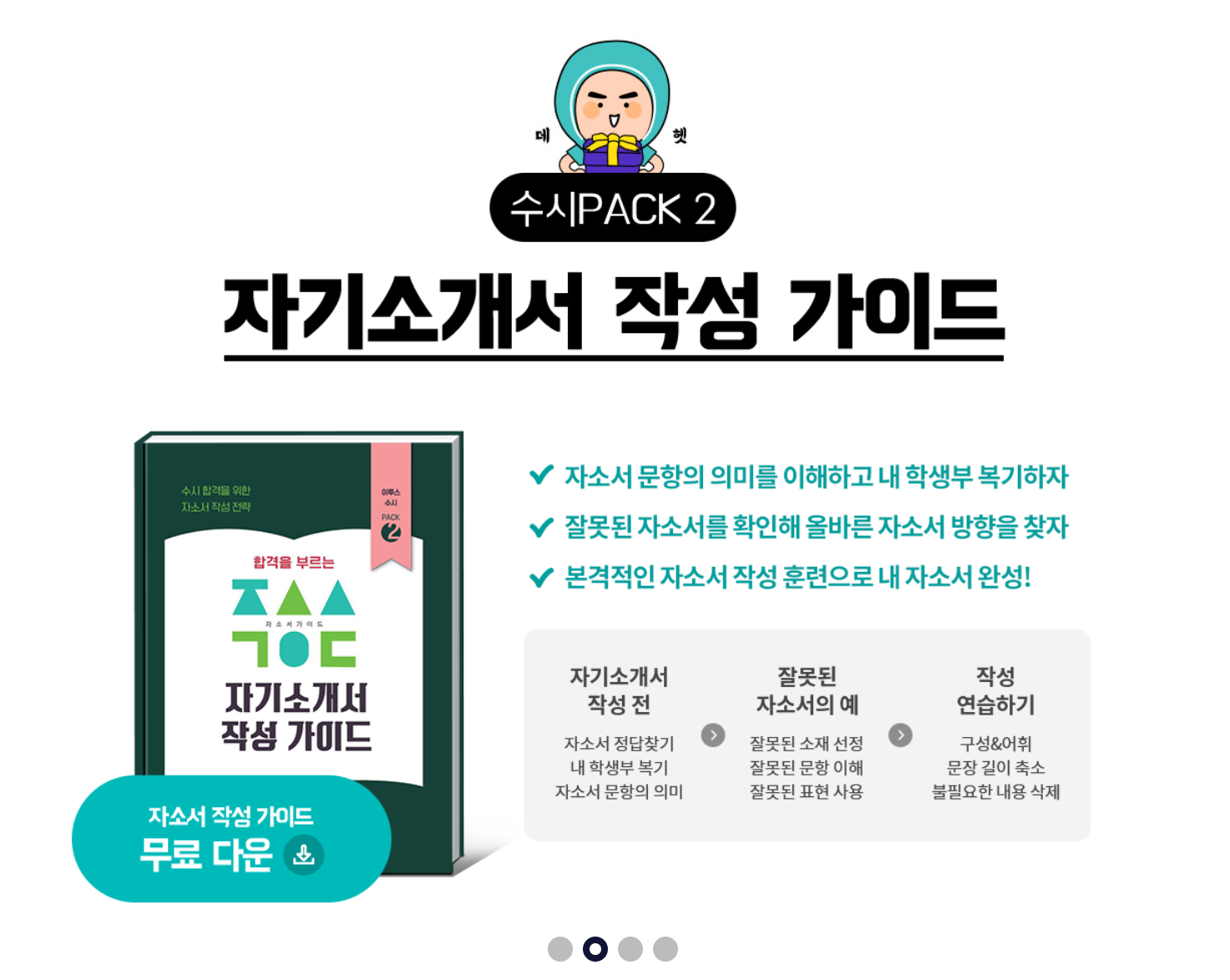 더 중요한 정보들이 담긴 수시팩1 : 2023 수시 지원 전략 설명회 자료집, 수시팩2 : 자기소개서 작성 가이드, 수시팩3 : 2023 수시전형 간편보기, 그리고 위의 수시팩4 : 2023 수시전형 일정표로 이루어져 있습니다. 2022년 7월 10일 현재, 4가지 팩 모두 다운로드 가능합니다.